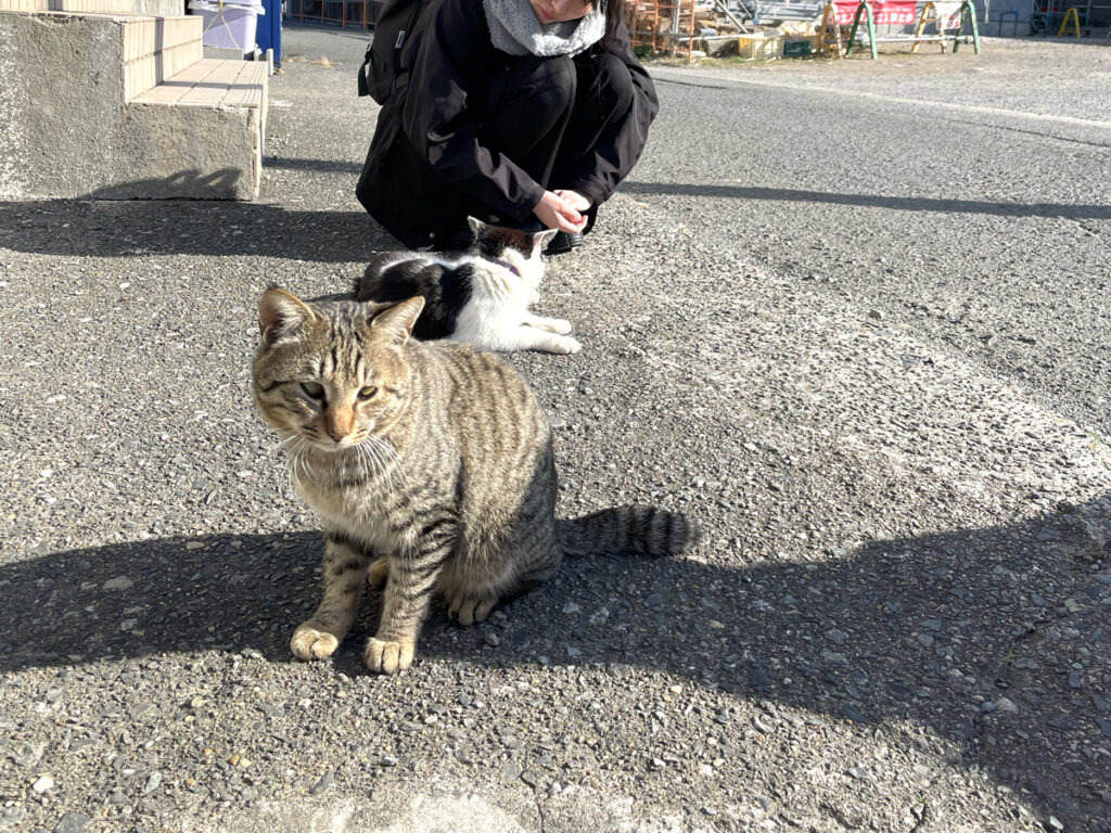 漁港には、釣り人が釣った魚を目当てに たくさんの猫たちが集まります。 1匹の猫が近づいてきたことをきっかけに、 自然と写真タイムが始まりました。