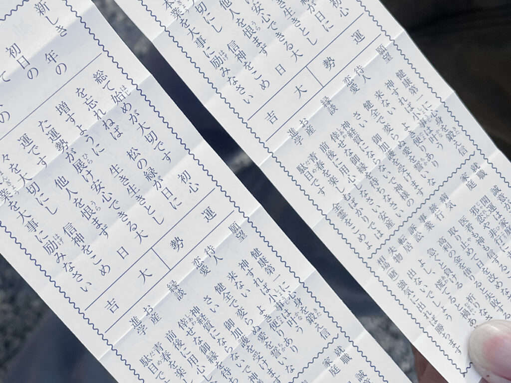 立派なイチョウの木や、 御神木とされている槙の木など、 神々しく力強い植物のエネルギーを感じることができます。 参加者の方が引いたおみくじが2枚とも大吉で、 私もその運をお裾分けしていただきました。