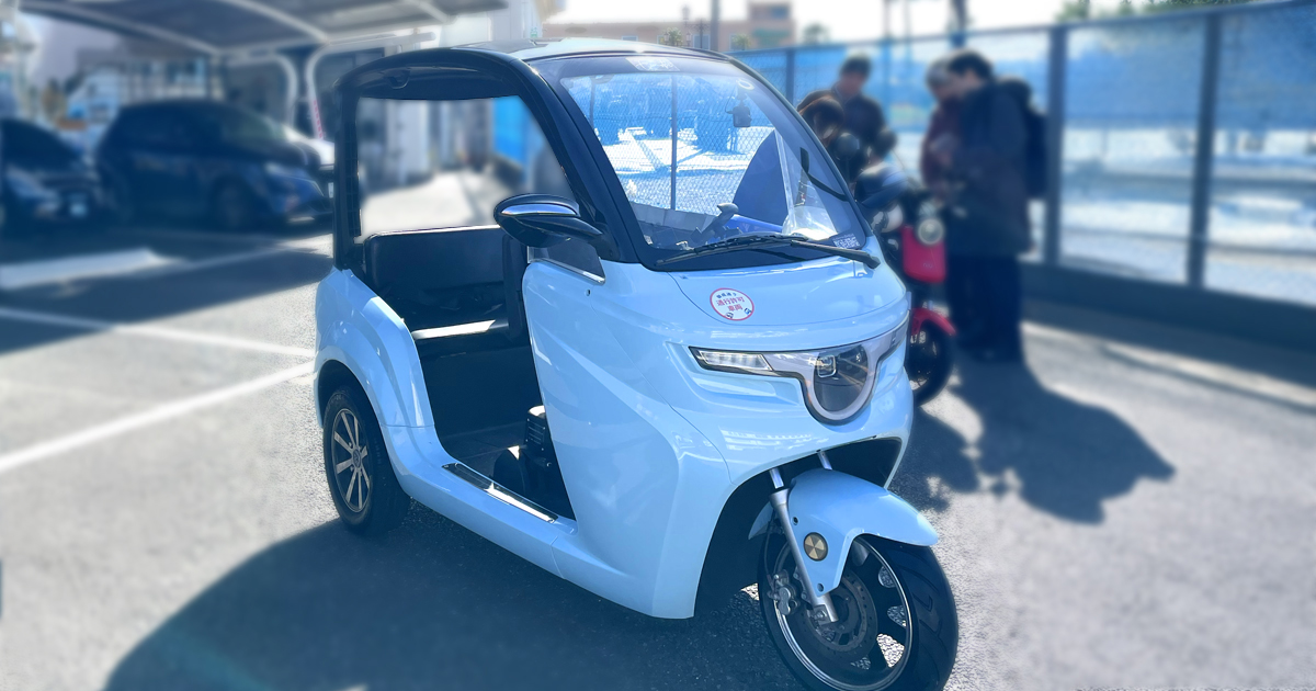 この乗り物は、小型バイクのような感覚で乗り回すことができ、 3人乗りで車道を走行できるモビリティです。 平坦な道で最大時速45kmほど、 フル充電で距離にして40km程度の走行が可能となっています。