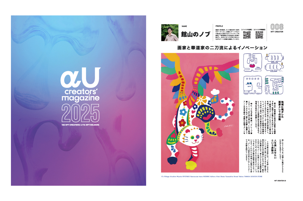 αUクリエイターズマガジン2025(KDDI発行)に、見開き2ページにわたるアーティスト紹介記事が掲載された。本誌はNFTやデジタルアートを軸に、次世代のクリエイターとその活動を広く紹介する媒体であり、クリエイターにとって作品発表やポートフォリオとしての役割も担っている。